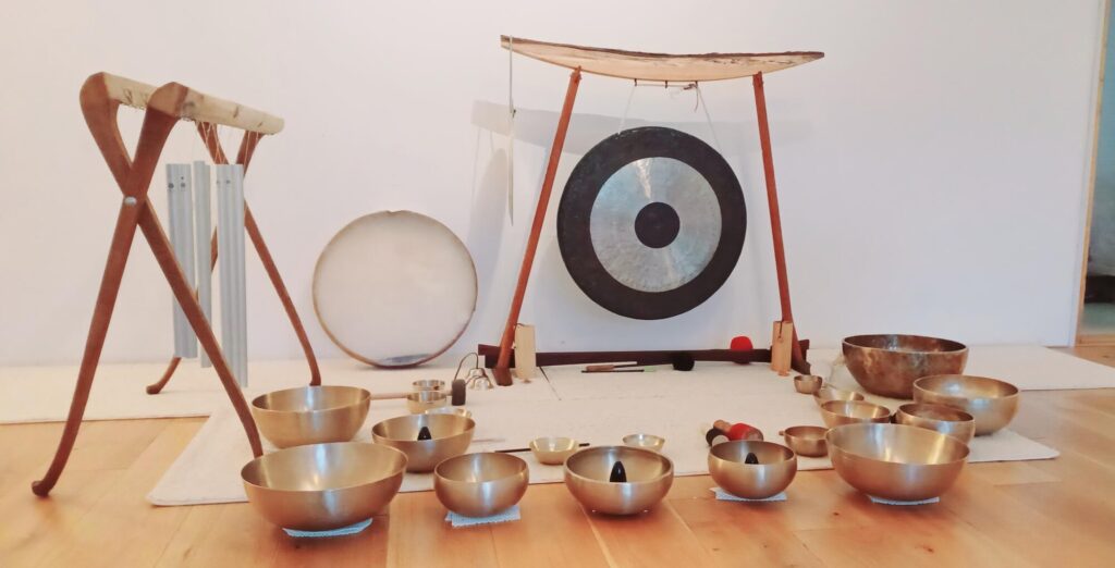 Klankbeleving met verschillende klankschalen, klankbuizen, gongen en andere instrumenten.